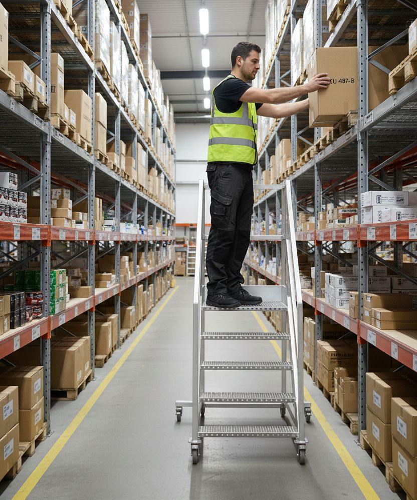 Een mobiele of verrijdbare bordestrap is ontworpen voor precies dit soort situaties. Niet als “handig hulpmiddel”, maar als vaste voorziening voor veilig werken op hoogte in magazijnen.